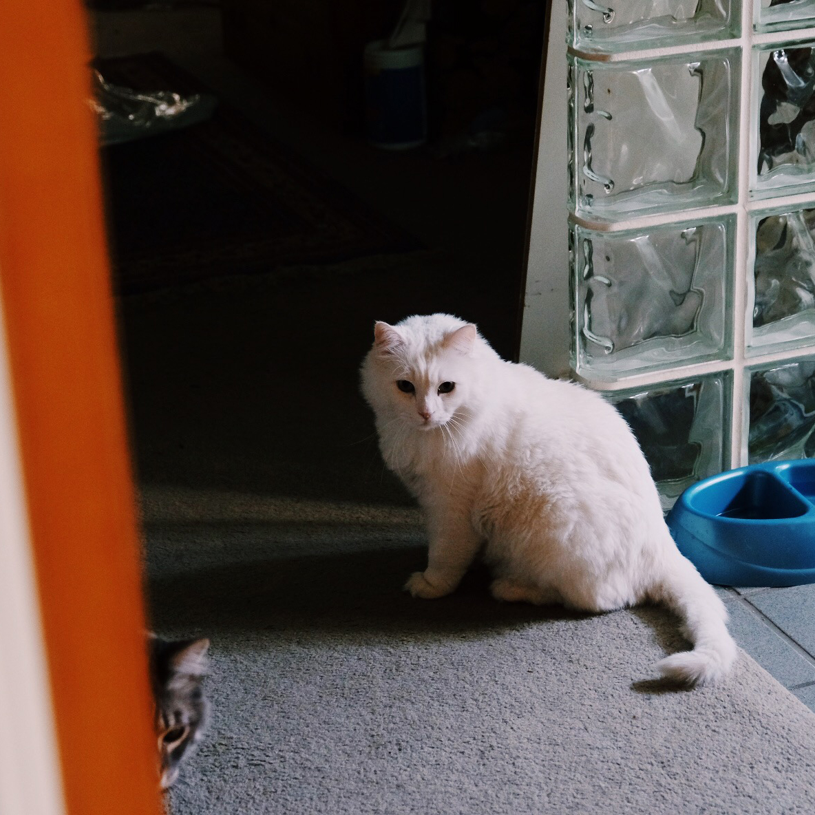 Shy Snow and Shy Tubby, not happy about the dogs being around