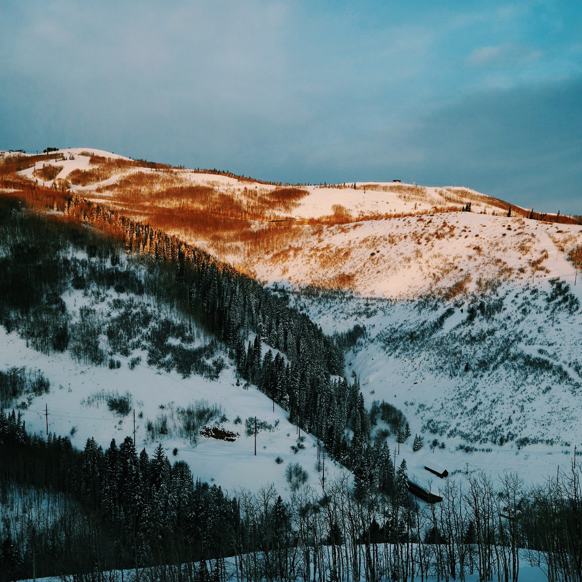 Early morning sun touches the tops of the snow peaks. We’re out on the slopes today and I will *try* to ski.